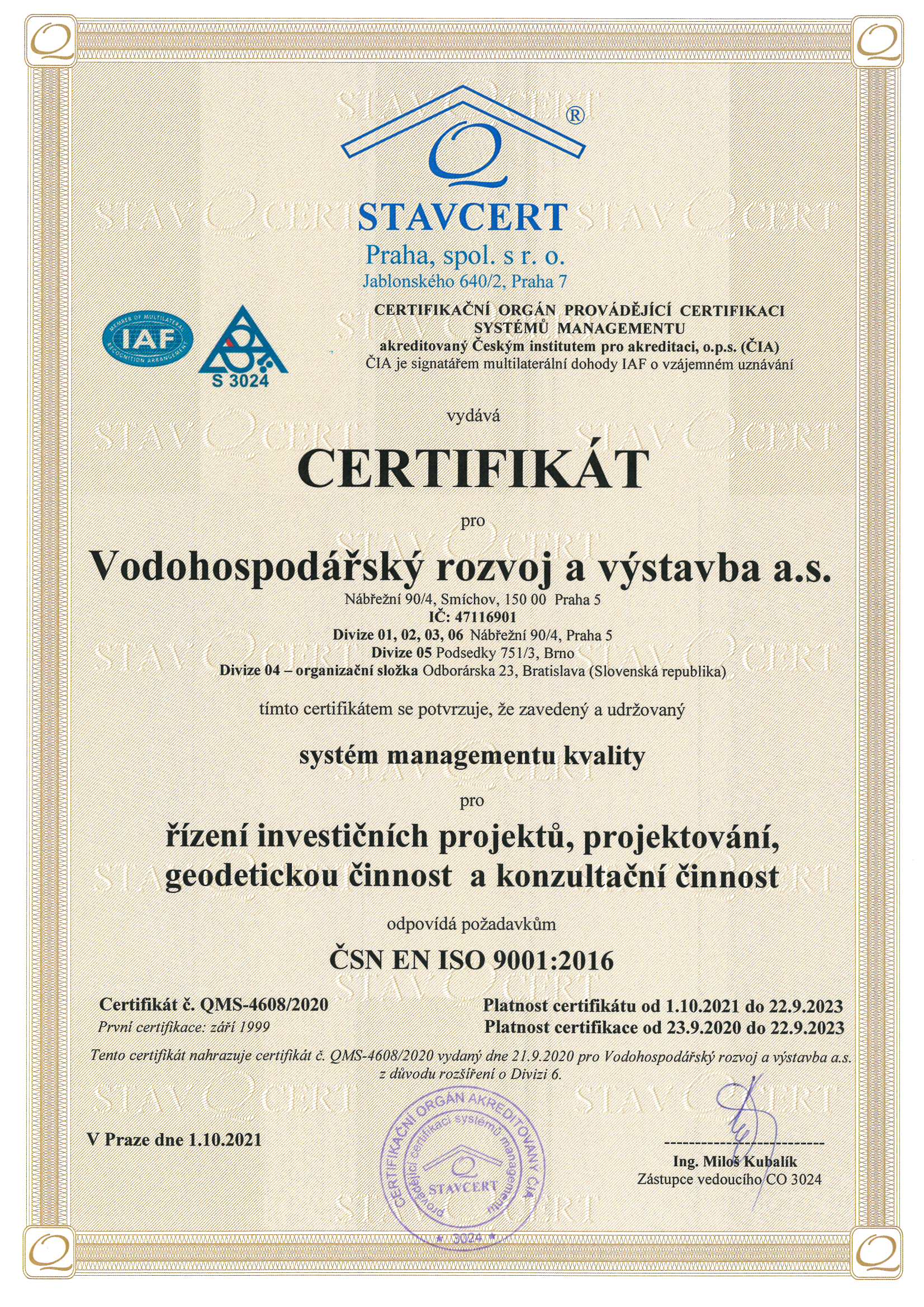 Vodohospodářský rozvoj a výstavba a.s. (dále jen VRV a.s.) má zaveden a certifikován integrovaný systém managementu zahrnující systém managementu kvality, systém environmentálního managementu a systém managementu BOZP. Tento integrovaný systém je doložený platnými certifikáty ČSN EN ISO 9001:2016 a 14001:2016 a dále dle ČSN ISO 45001:2018. Zásady těchto systémů jsou uvedeny v Politice integrovaného systému managementu kvality, environmentu a bezpečnosti vydané vedením společnosti.